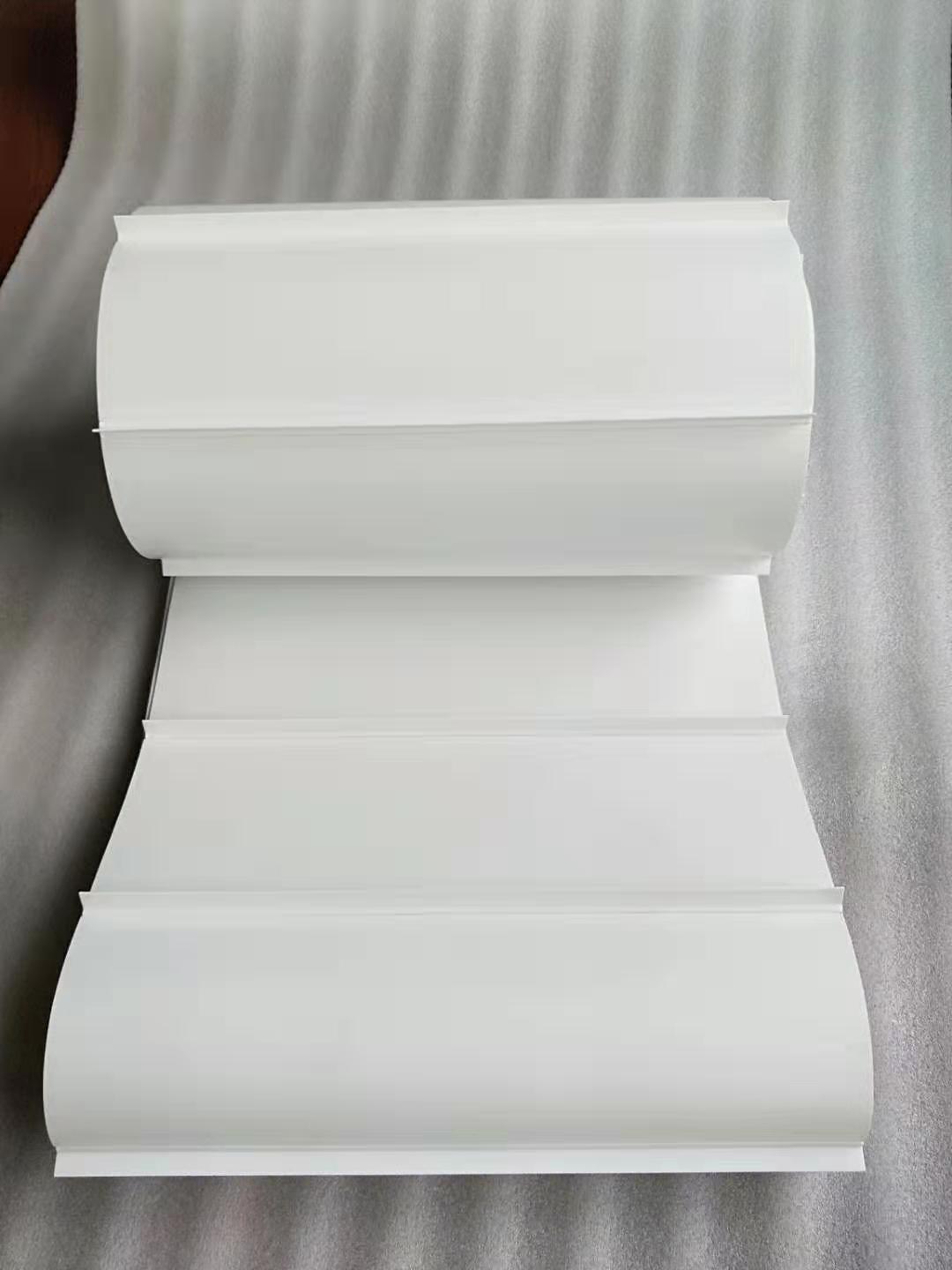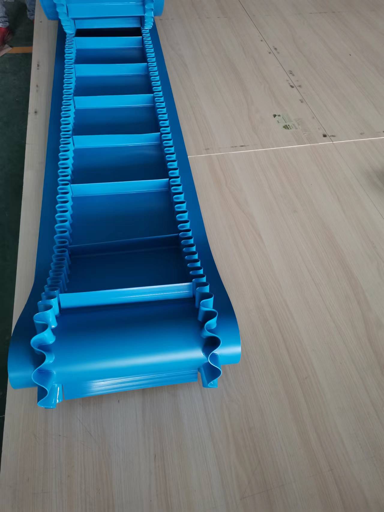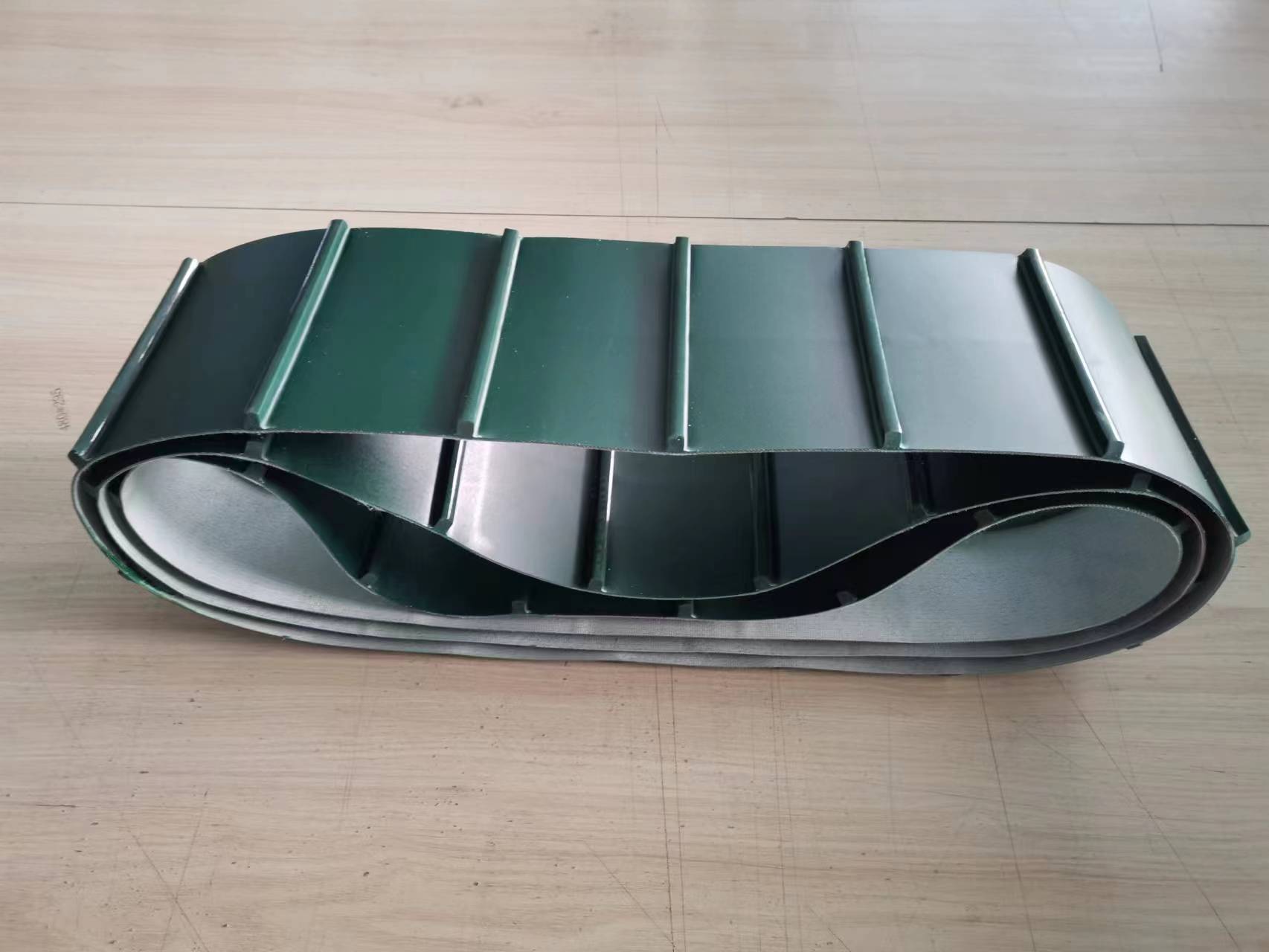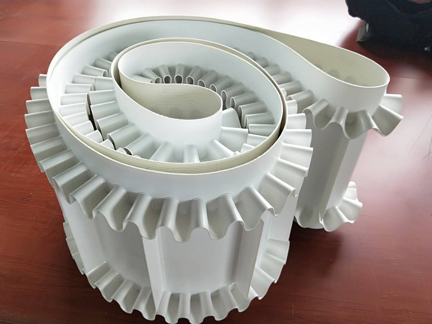 PU白色食品輸送帶(裙邊擋板帶),擋邊起防止物料測(cè)滑撒落的作用。為便于轉(zhuǎn)彎,裙邊設(shè)計(jì)成波紋狀;橫隔板的作用是承托物料,為了實(shí)現(xiàn)大傾角輸送,采用T型TC型。檔邊和橫隔板是用二次硫化的方法與基帶連接的,具有很高的連接強(qiáng)度。用于輸送易散落的粉狀、粒狀、小塊狀、糊狀及液態(tài)狀物料。