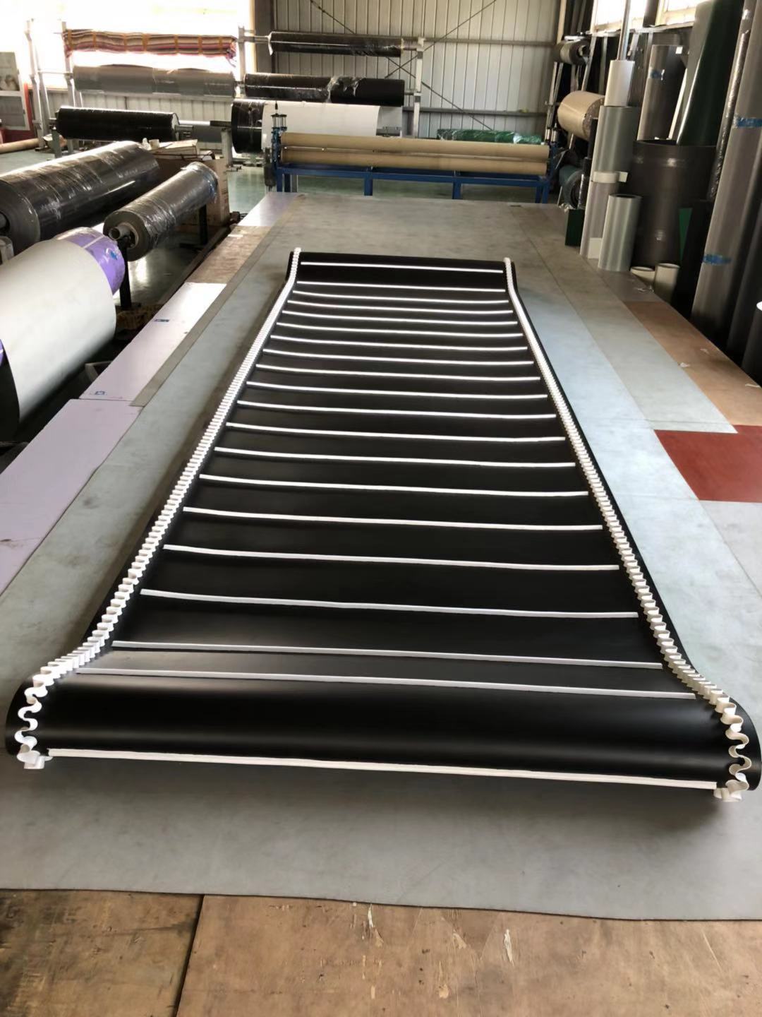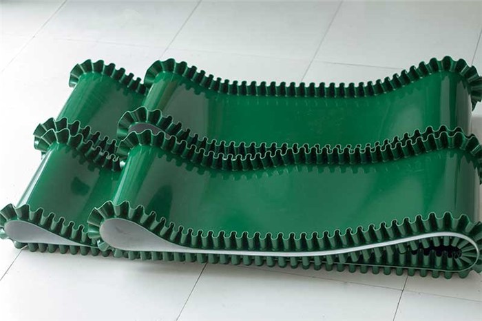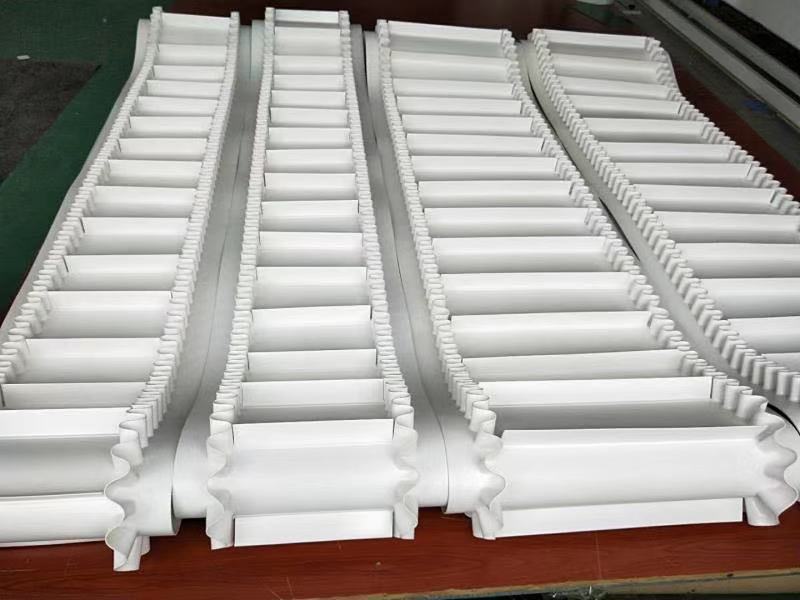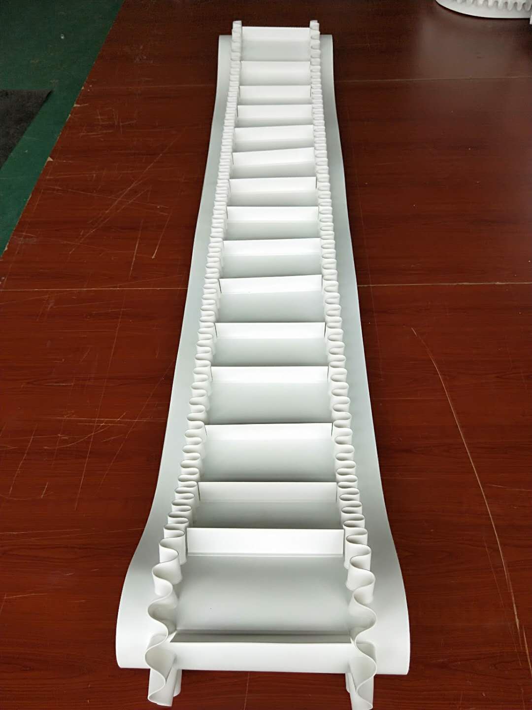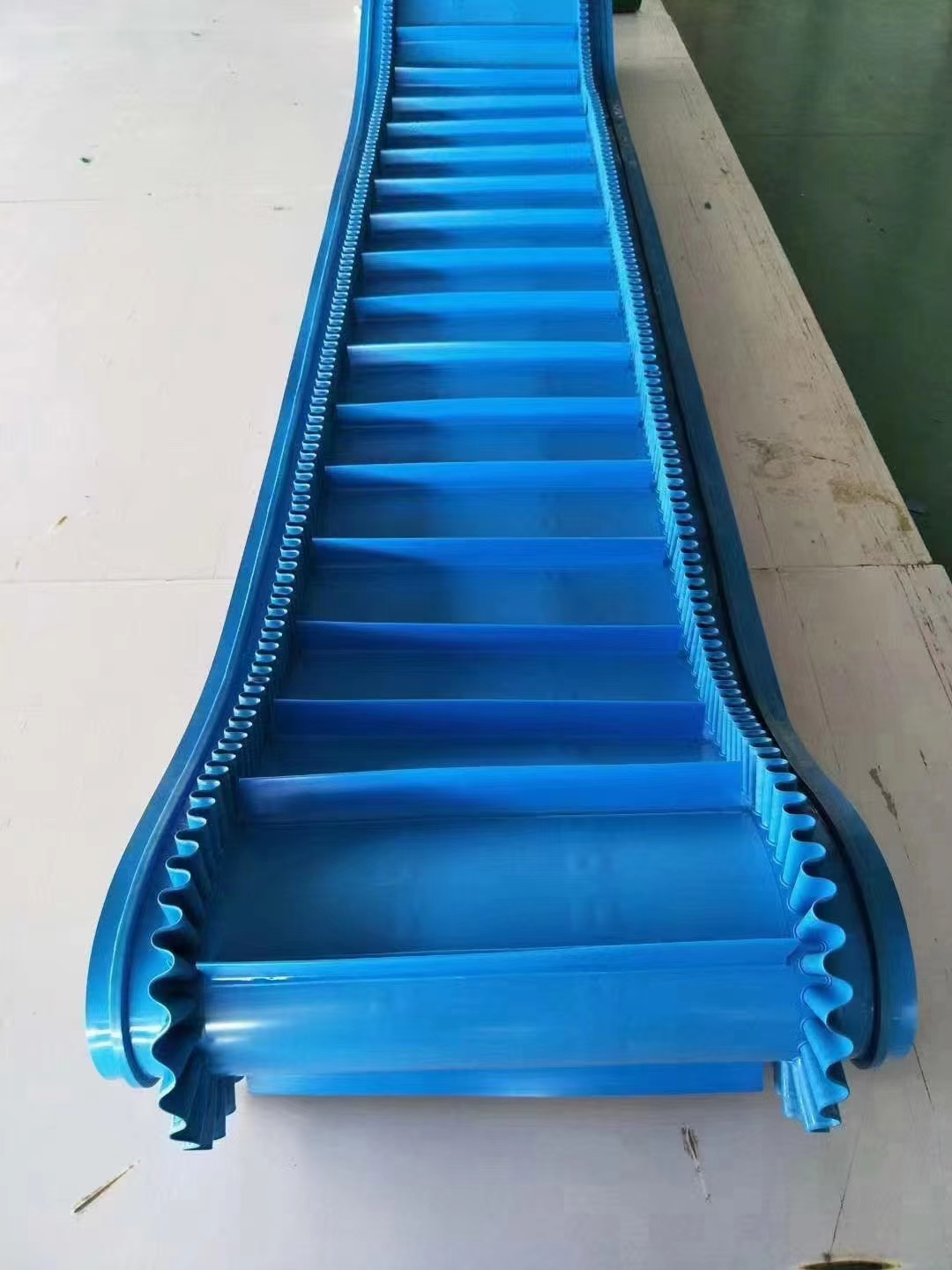 輸送帶(裙邊擋板帶),擋邊起防止物料測滑撒落的作用。為便于轉彎,裙邊設計成波紋狀;橫隔板的作用是承托物料,為了實現大傾角輸送,采用T型TC型。檔邊和橫隔板是用二次硫化的方法與基帶連接的,具有很高的連接強度。用于輸送易散落的粉狀、粒狀、小塊狀、糊狀及液態狀物料。