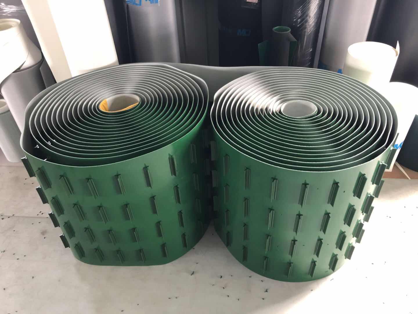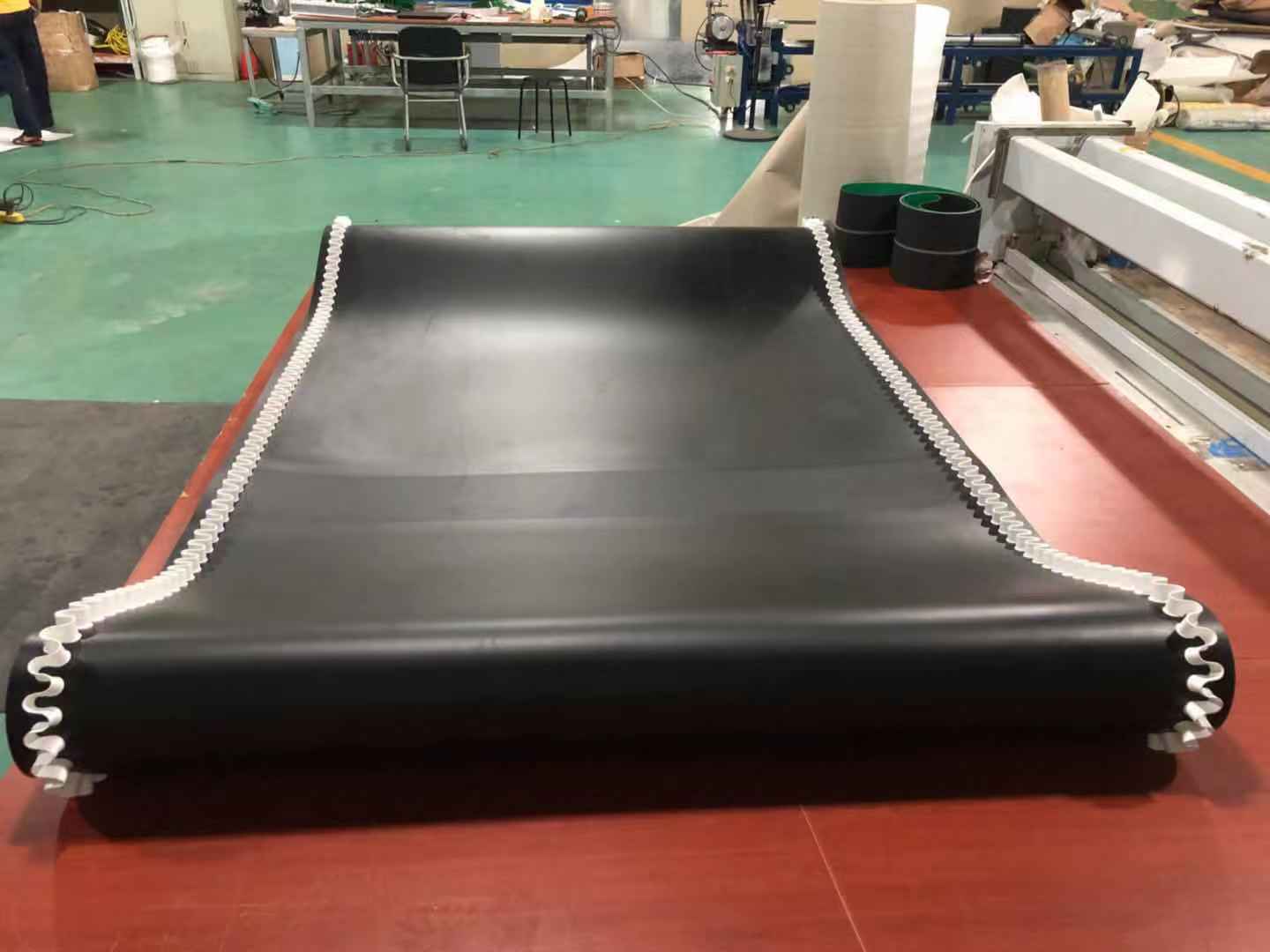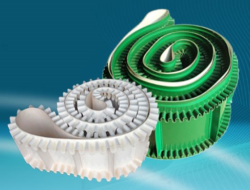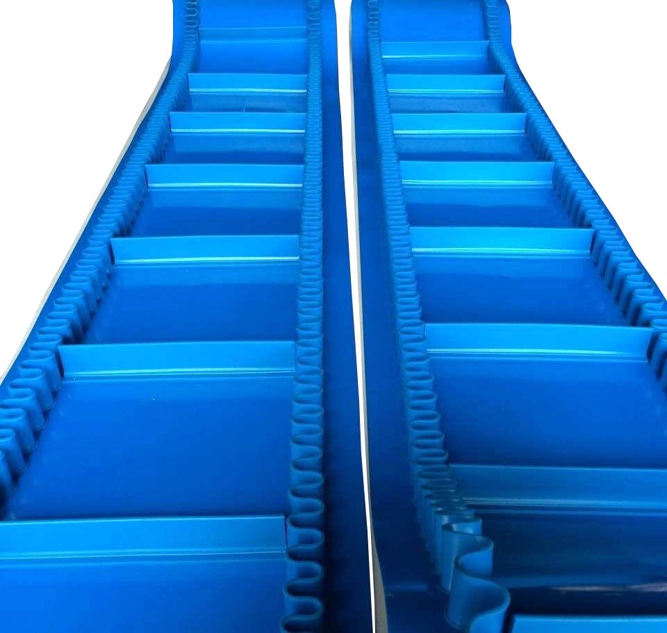 輸送帶(裙邊擋板帶),擋邊起防止物料測滑撒落的作用。為便于轉彎,裙邊設計成波紋狀;橫隔板的作用是承托物料,為了實現大傾角輸送,采用T型TC型。檔邊和橫隔板是用二次硫化的方法與基帶連接的,具有很高的連接強度。用于輸送易散落的粉狀、粒狀、小塊狀、糊狀及液態狀物料。