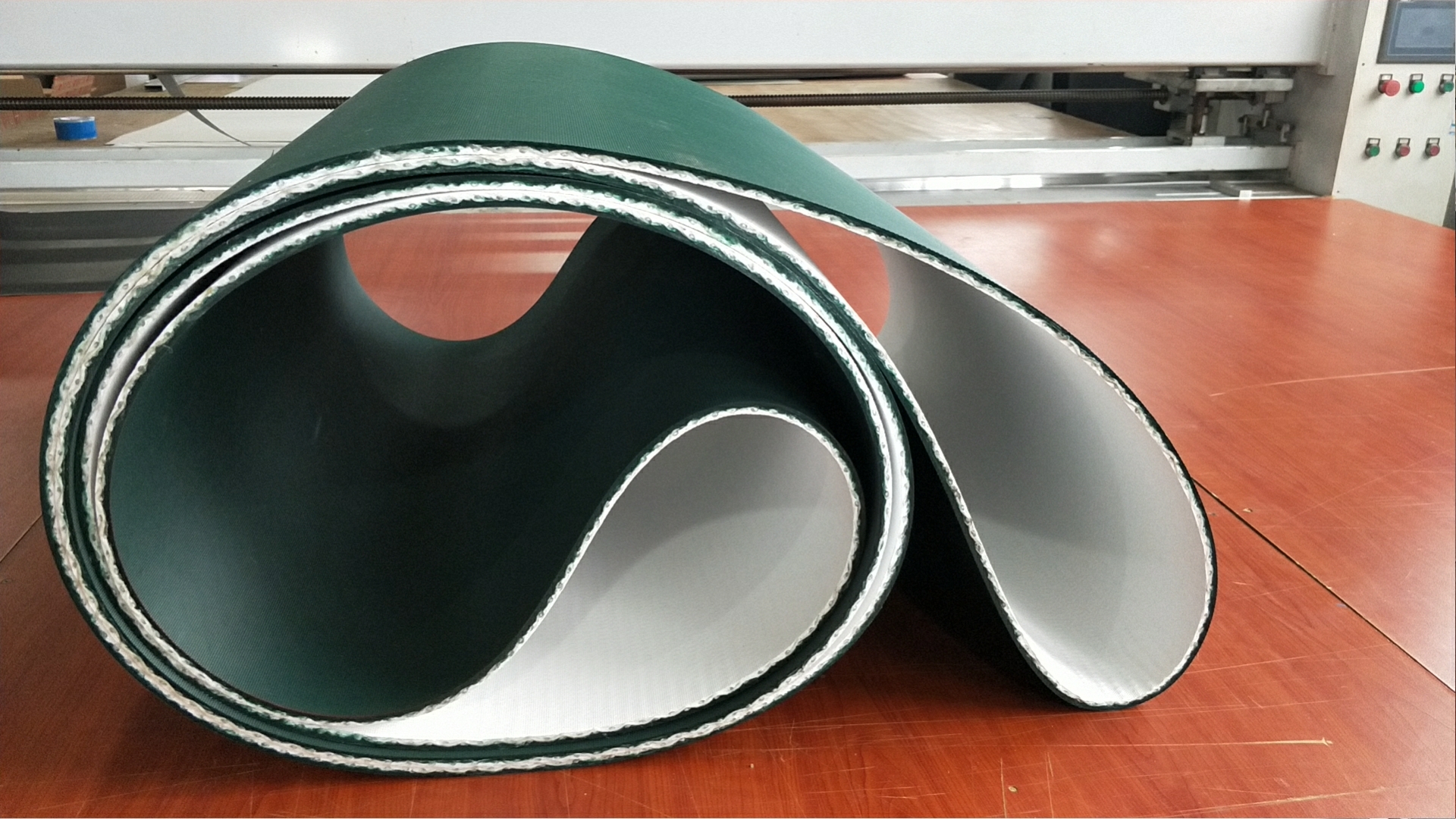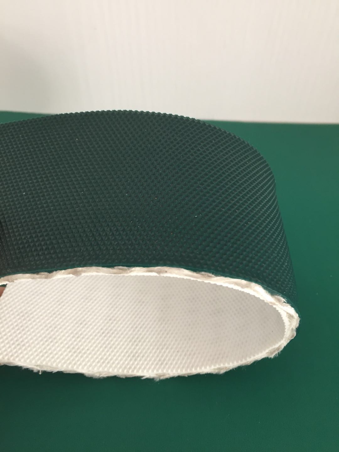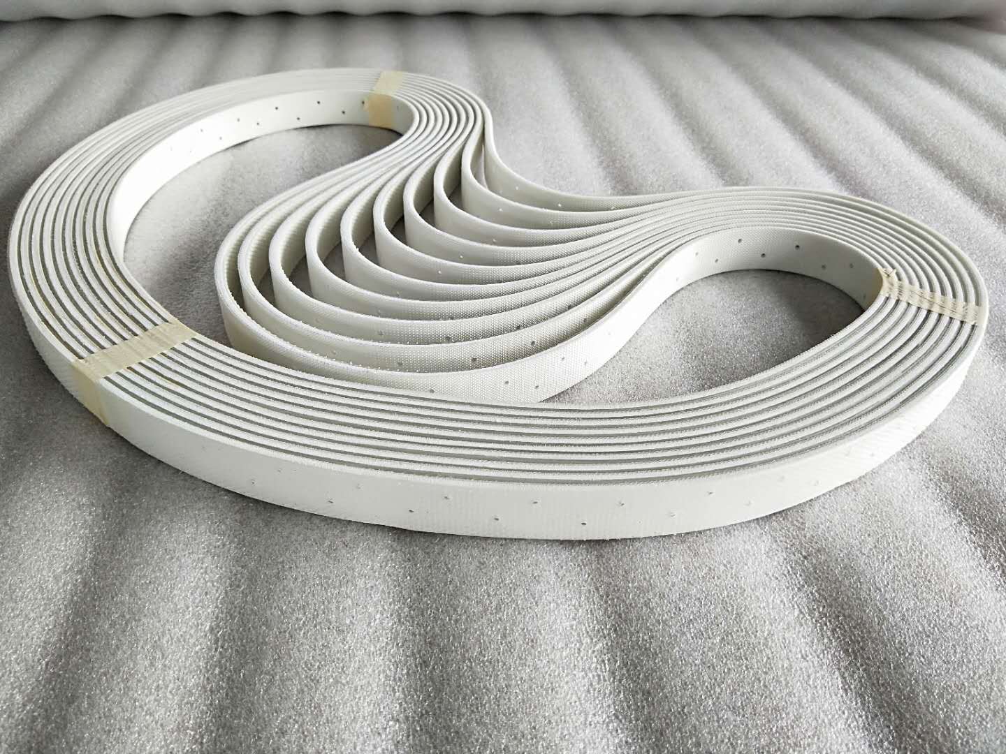 將紗線(xiàn)整經(jīng)穿棕,編織成無(wú)縫環(huán)帶;所述的紗線(xiàn)為高強(qiáng)低伸滌綸紗、對(duì)位芳綸紗或玻璃纖維紗;(2)將含水質(zhì)量百分比低于0.1%熱塑性聚氨酯彈性體橡膠刮涂于所述的無(wú)縫環(huán)帶。 助卷皮帶特性:
